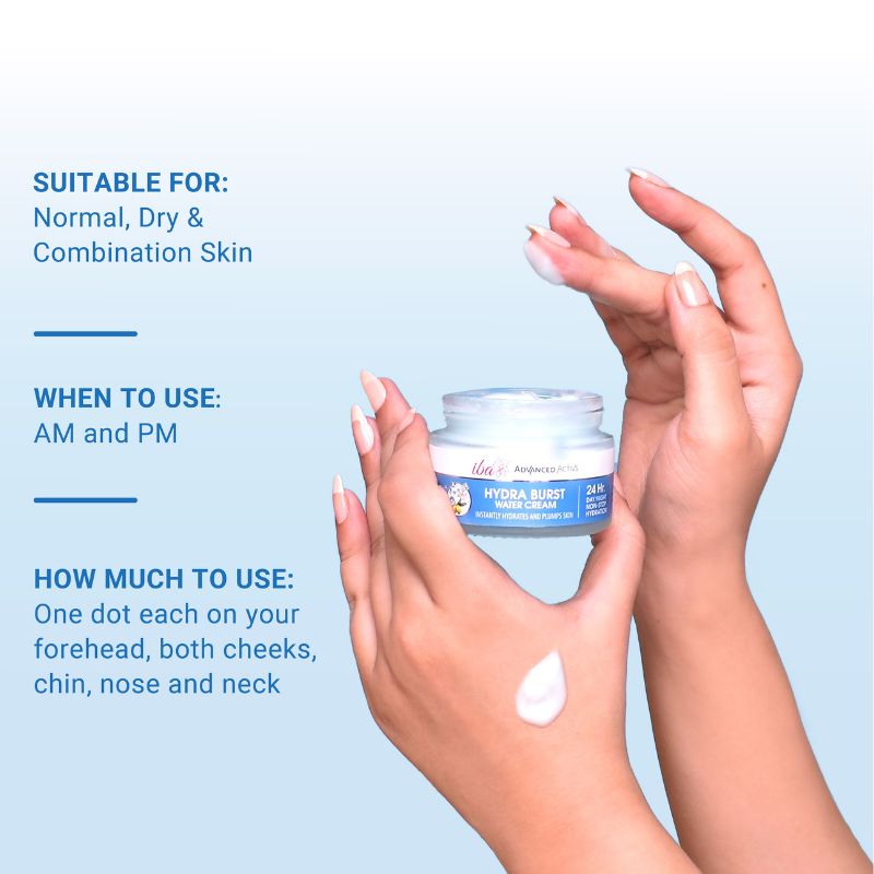 Iba Hydra Burst Water Cream reduces dryness, provides instant hydration and plumps the skin, helping to restore moisture and provide a youthful appearance.