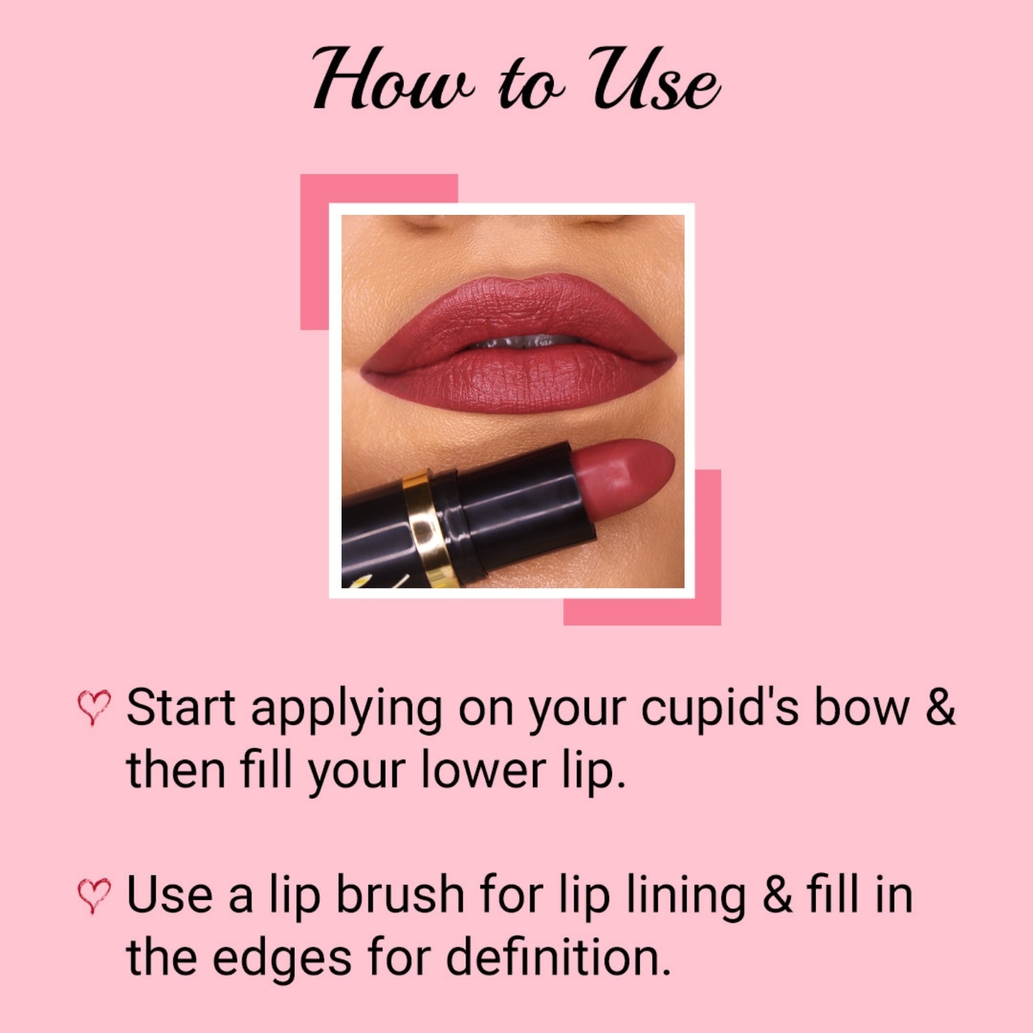 Fill your lips using the bullet of the lipstick. Use a lip brush if required to fill in the edges and add definition.