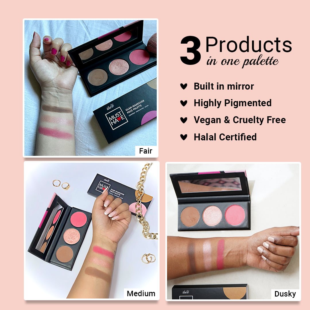 The Iba Must Have Glam Makeover Face Palette is 3 in 1 makeup palette that includes a blush, a highlighter and a contour.