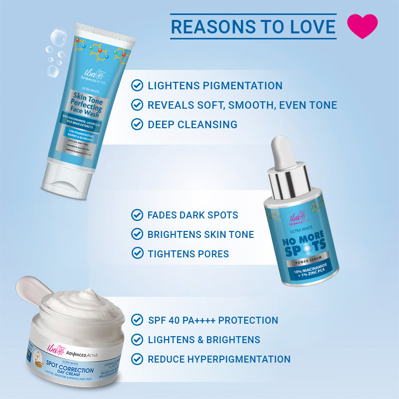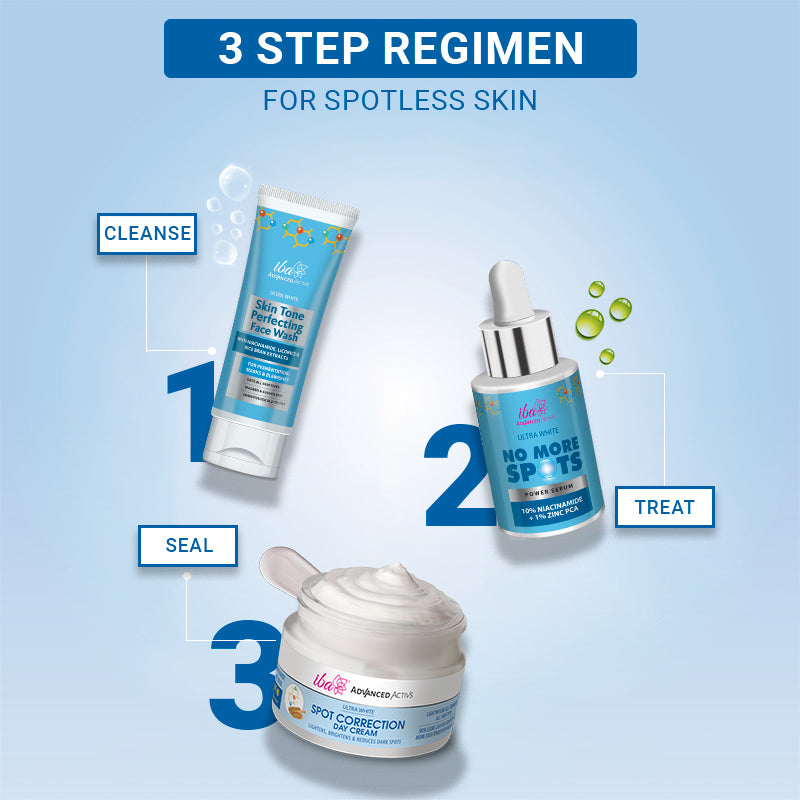 Net Content: Advanced Activs Ultra White Skin Tone Perfecting Face Wash(100 ml) + Advanced Activs 10% Niacinamide No More Spots Power Serum(30 ml) + Advanced Activs Ultra White 5% Niacinamide Spot Correction Day Cream SPF 40 (50 g)