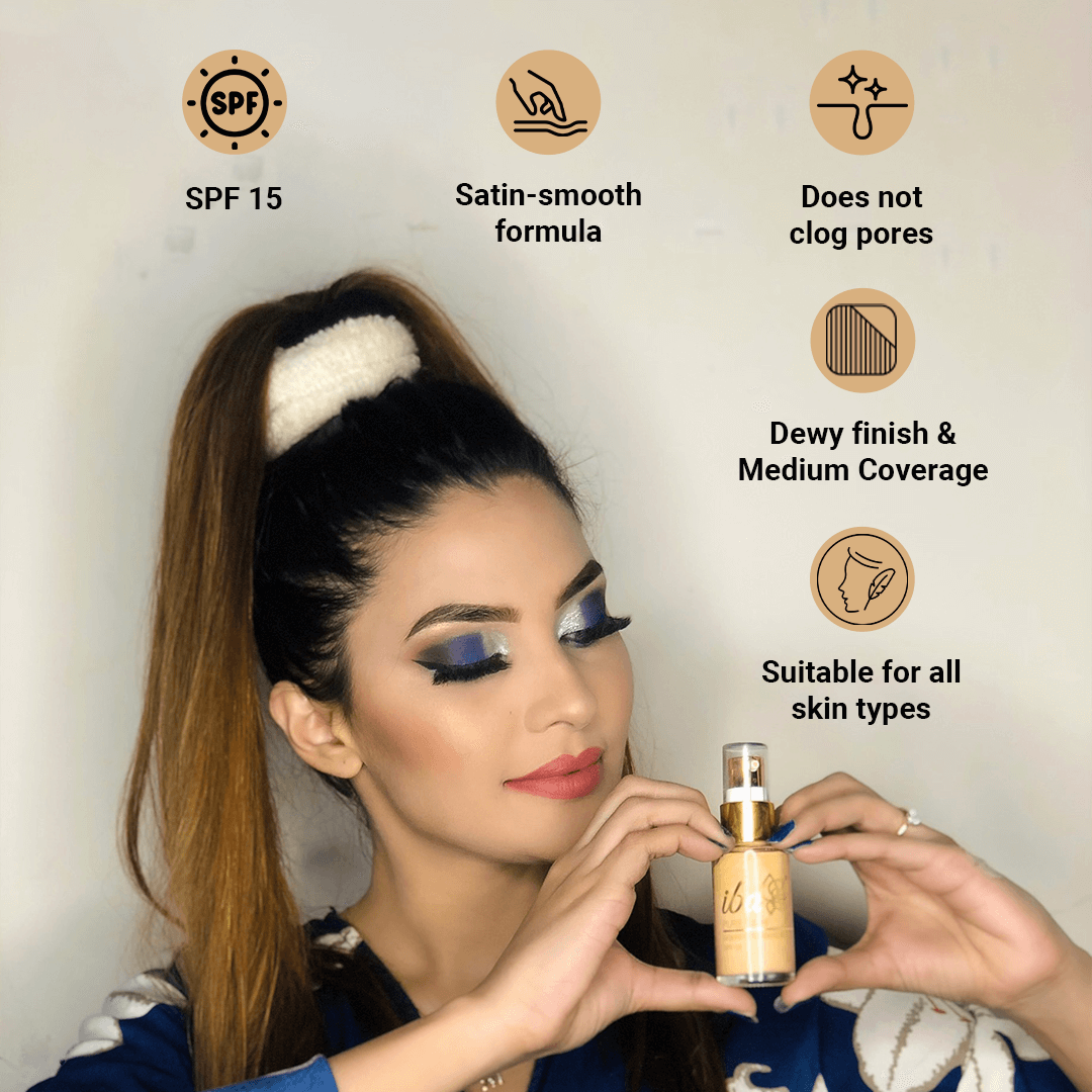 Iba Pure Skin Liquid Foundation SPF 15 is ultra blendable satin smooth formula boosted with Aloe Vera, Vitamin E and rich minerals that provides dazzling, long lasting glow and full coverage.