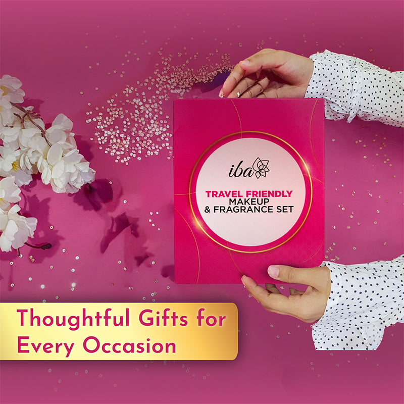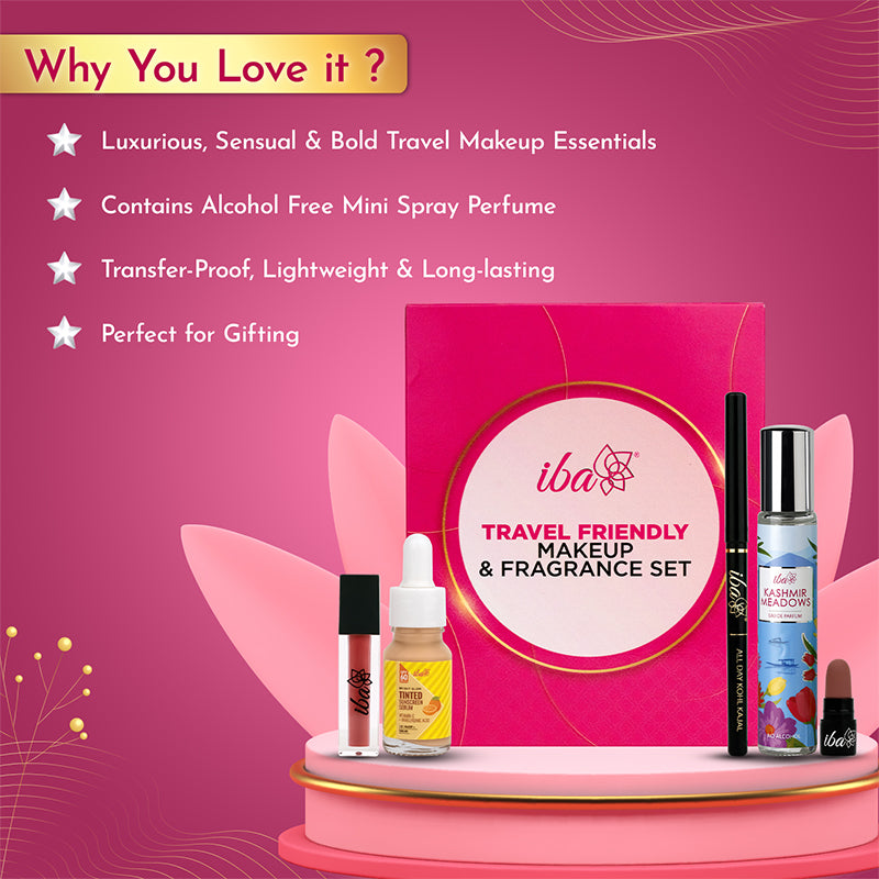 The Iba Travel-Friendly Makeup & Fragrance Set is a makeup kit featuring mini beauty essentials, perfect for on-the-go touch-ups and travel.