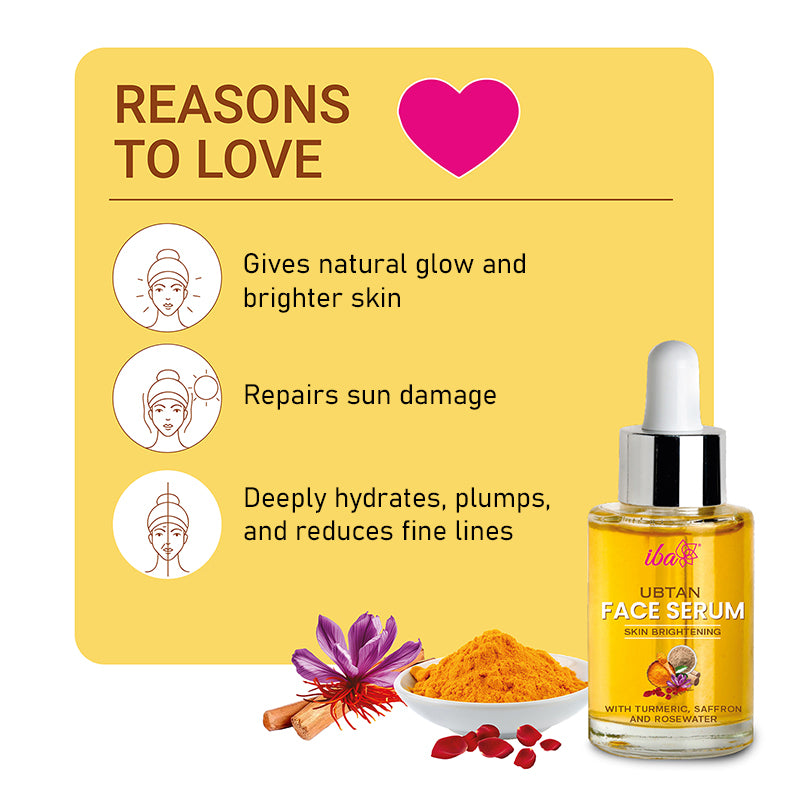 Iba Ubtan Serum brightens your skin and enhances its natural glow. It repairs sun damage, deeply hydrates, plumps the skin and reduces fine lines for a youthful, radiant complexion.
