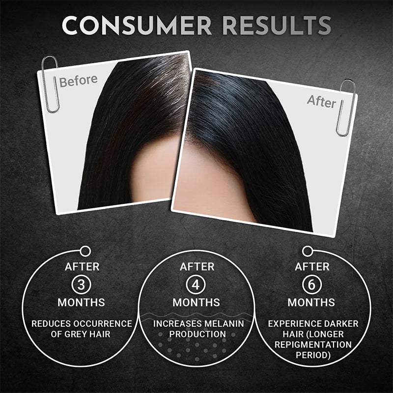 It works by nourishing the hair roots and enhancing melanin production to reduce the appearance of grey hair.